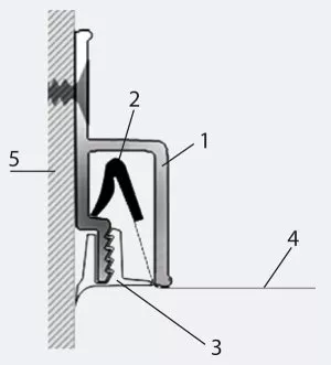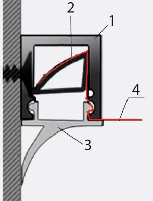 Kolejnym typem profili do mocowań folii sufitowych PCV (rzadziej tkanin) jest tak zwany profil klinowy (rys. 4). W tym celu wykorzystywany jest profil aluminiowy zbliżony kształtem do „n” oraz plastykowy klin. Profil mocujący jest zamykany od dołu listwą wykończeniową. W przypadku zastosowania tego typu profili mocujących większość producentów sufitów nie przewiduje przyspawania harpunów do folii.