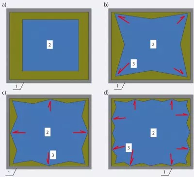 4. Do środka każdej ściany mocowane są środkowe części płatu sufitowego (rys. 1d). Dalej czynność ta powtarzana jest na pozostałych krótszych odcinkach ściany. Mocowanie płata sufitowego odbywa się od narożnika w kierunku centrum ściany. W wyniku opisanych czynności płat sufitu napinanego zostanie zamocowany w profilu montażowym.
